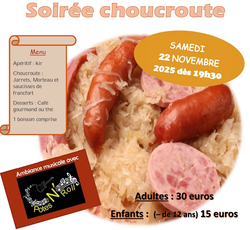 Samedi 22 novembre 2025 Soirée choucroute / musique live à partir de 19h30 à la Salle Michel Cacheux Menu : apéritif, choucroute, dessert, boisson Animation musicale : "Potes N' Roll" Adultes : 30€ / Enfants (-12) 15€ Réservation obligatoire (cliquer sur l'image pour télécharger le bulletin de réservation) |