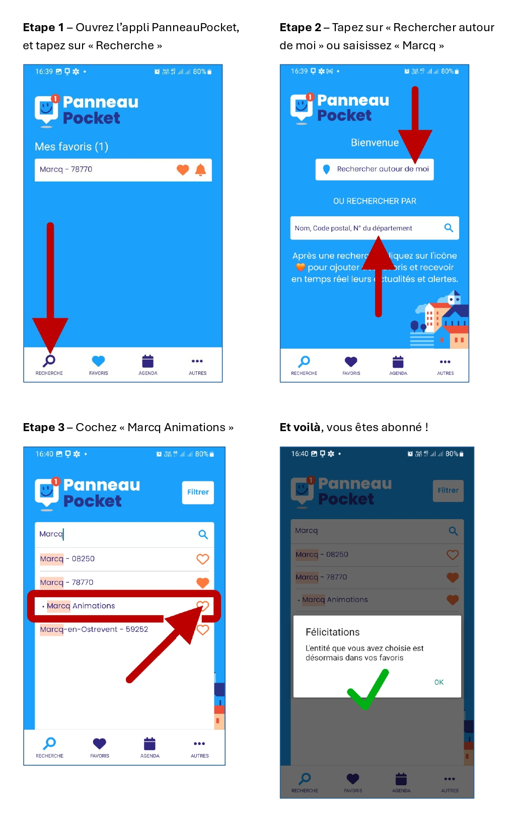 Continuez de recevoir les infos sur les animations du village, manifestations festices, culturelles, ou sportives, en vous abonnant à la nouvelle entité PanneauPocket, "Marcq Animations"